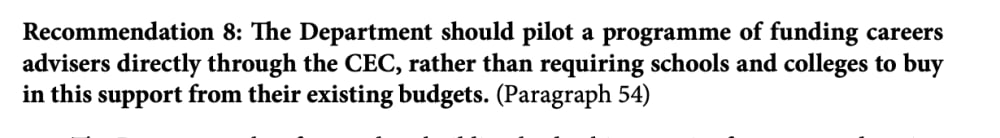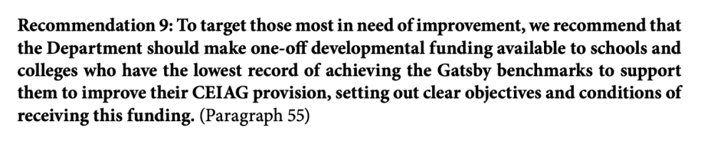 - No more money we fund the CEC and working towards the Gatsby Benchmarks improves outcomes for those schools who experience a high number of pupils in need for further support.